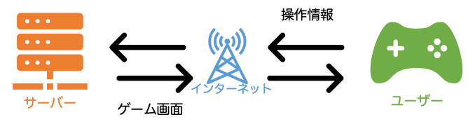 一般のゲームはソフト(アプリやゲームソフト)にプログラムが入っていてハード(ゲーム機)が実行していますよね。それに対してクラウドゲームはサーバー(クラウド)にゲームのデータが存在し、プレイヤーの操作がクラウドに送信され、サーバーが処理、モニターにゲーム映像が送られます。これをまた見て操作してゲームを行うことができます。