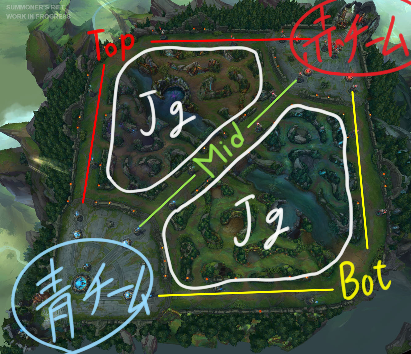 LoLとはほぼ正方形のステージ中にTOP・MID・BOTと呼ばれる3本の道と、道の間にJungle(以下jg)と呼ばれる森が存在します。
