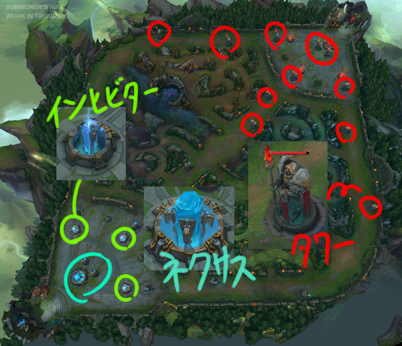もちろんネクサスまでは一筋縄ではいけません、それぞれのレーンには3本のタワーと呼ばれる守護とインヒビターの2種類のオブジェクトが存在します。