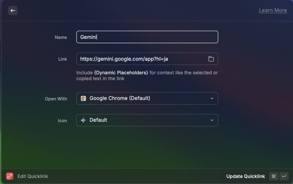 NameにRaycast上で検索する際の名前、Linkに指定したいURL、Open Withでどのアプリで開くかを設定できます。