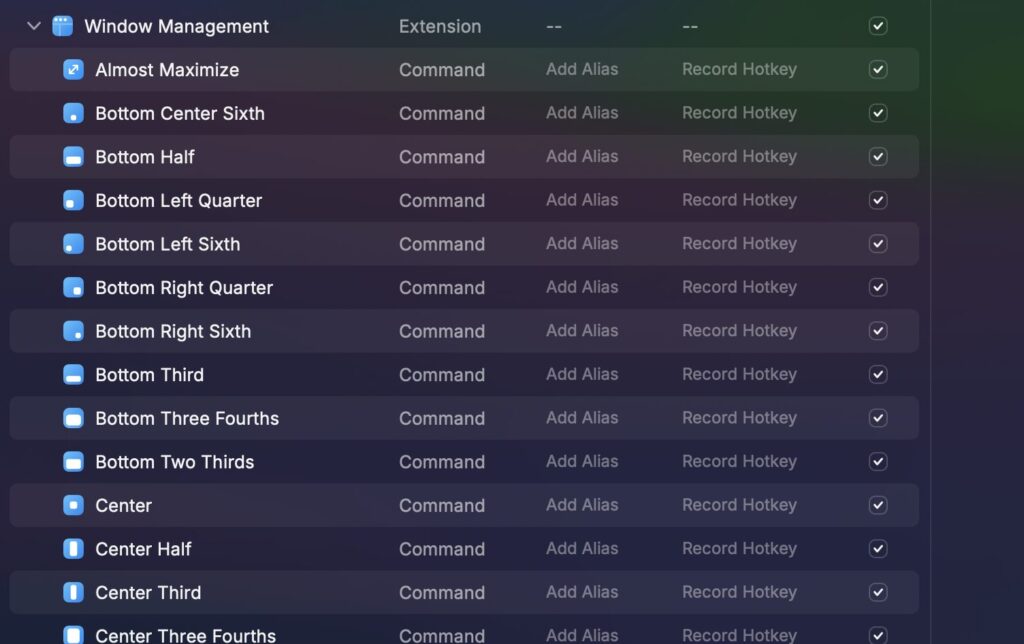 先ほど紹介した、Hotkeyの登録と同様にExtensionsからWindow Managementを検索するとこの画像のような画面が出てきます。